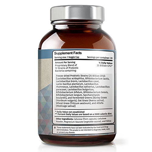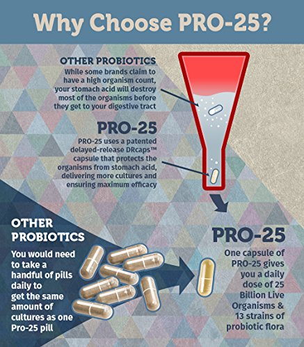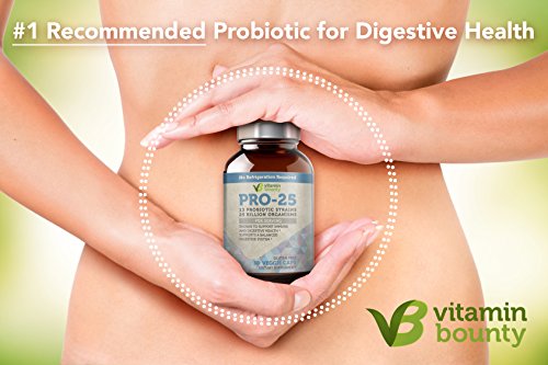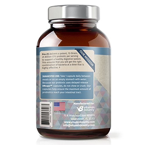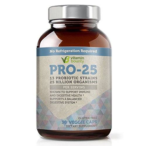 -. Feature : Vitamin Bounty's Pro 25 offers an potent, 25 Billion organisms per capsule, making it one of the most effective probiotics on the market. / Unlike other probiotics that only contain 1 or 2 strains of probiotic, Pro-25 has 13 probiotic strains, ensuring you will get the support you need for your overall digestive health. / Pro-25 uses a patented delayed release capsue, that protects the live organisms in the capsule from stomach acid, delivering more cultures and ensuring maximum efficacy. / The capsue itself is a delayed-release vegetable capsule, developed and tested in a NSF certified facility. The potency and purity is guartneed. / Includes a number of strains not found in other probiotics (see complete list below), as well as Fermented Greens. This combination can help with digestive issues ranging from lactose intollerance, to IBS, or mild-upset stomach due to traveling.