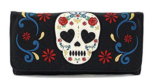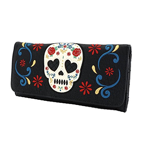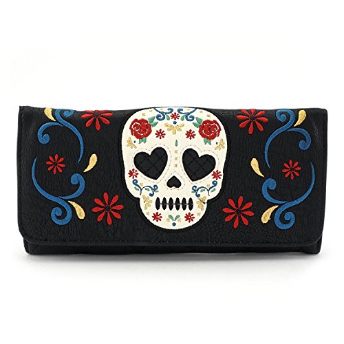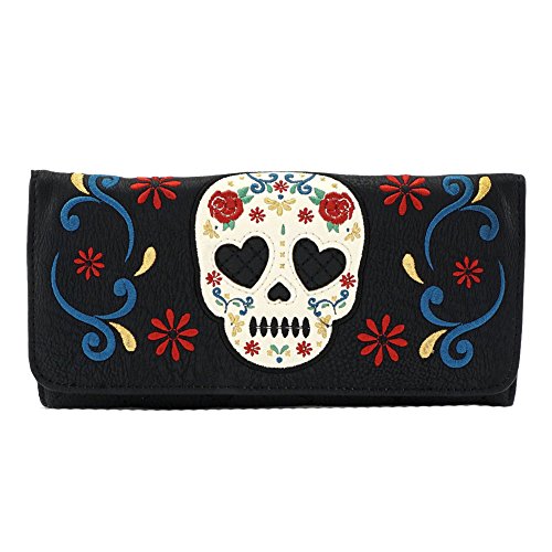 Product DescriptionFaux leather tri fold wallet with applique skull and embroidered roses.0