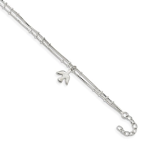 Solid 925 Sterling Silver Polished 2-Strand Dove 9in with 1in Ext Anklet 9" (1mm)