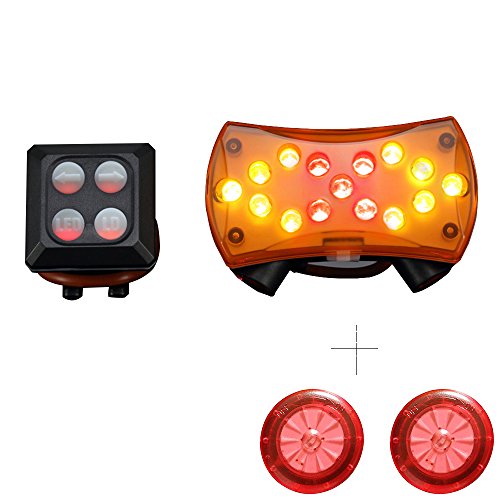 -. Feature : Turn Signals- With turn left and right indicators, when the arrows-shaped turning light is on, the motorists behind you will know the way you are about to turn, makes you more visible and safer. / Wireless Remote Control- There are four buttons corresponding to four different light- turn left light, turn right light, basic taillight, laser lamps. Performance each indicator light is just a matter of buttons presses. And the remote has led indicators on it telling you what function you have on. / Rechargeable & Waterproof- It is rechargeable, coming with a 32 cm micro USB cable, convenient and durable. IPX4 Waterproof, it can work well in a light to moderate rain. / Laser Lamps- There are two laser beams that throws two laser lines to your sides to sort of create a visual barrier that makes someone keep a distance with you. / Easy to Install and Remove -Securely and easily install the light and controller on your bike only with two rubber bands, no any tools required. The rear light is adjustable, you can adjust it on the seat tube to a good angle.
