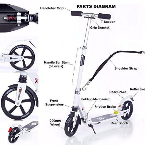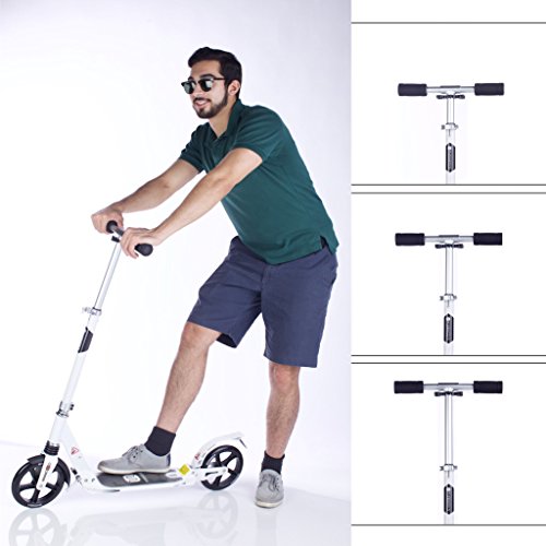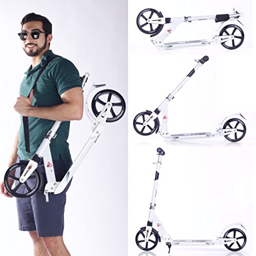"The safe and sturdy aluminium foldable scooter has become a VERY convenient ride to get to places 3 TIMES quicker than walking. It only requires just a few scoots by your shoe and you'll be swiftly gliding through any hard surface.The resilient aluminium material helps it withstand years of use. It's foldable capability alows for a compact way to transport the scooter in many ways, such as a bag or by hand. As you can handle it pretty everywhere such as in plane, train, or in you car, It will be the perfect friend for your daily use or during week-end !Feature