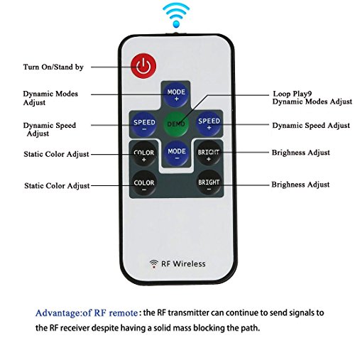 Upgrade RF wireless remote help you creative the fantasy light effect more freely! 20kinds of stable colors, 18kinds of color changing models, 6levels dimmable function, 6levels speed. No need to aim at the receiver, even penetrate walls and doors, no conflict with TV remote controller