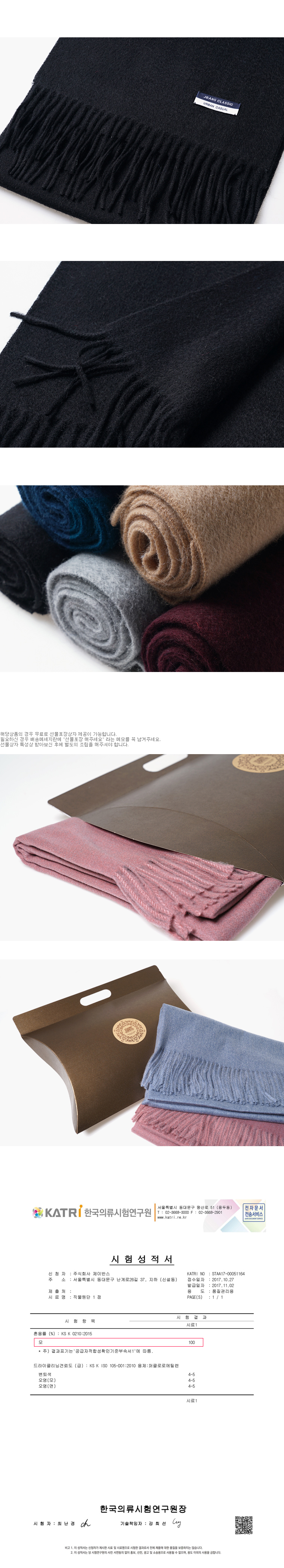 소재 - 울(모)100% 색상 - 블랙 사이즈 - 약169cm x 약31cm 제조사 - ㈜제이반스 제조국 - 중국OEM 제조년월 - 2017.10 이후