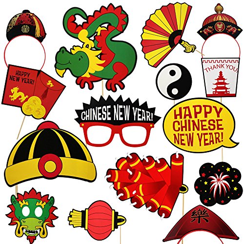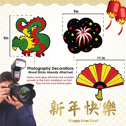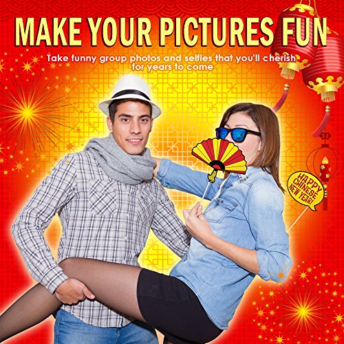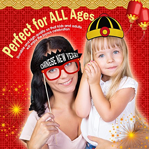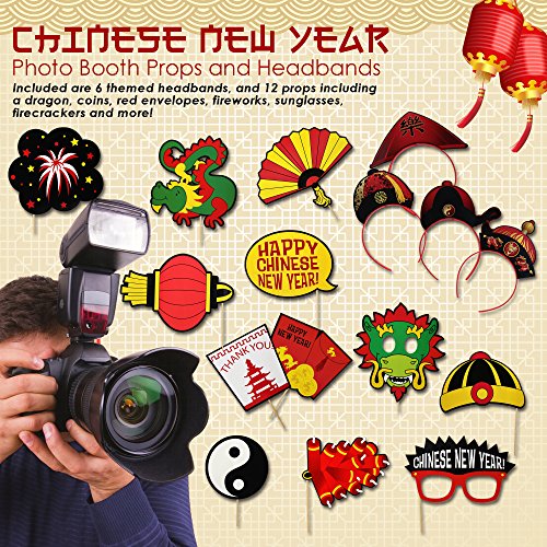 - MAKE YOUR PICTURES FUN - Included are 6 themed headbands, and 12 props including a dragon, coins, red envelopes, fireworks, sunglasses, firecrackers and more