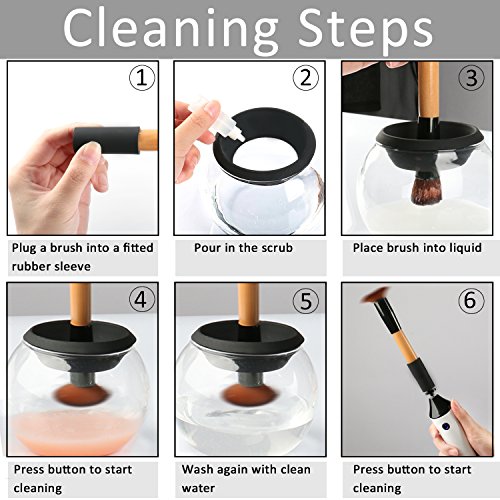 - EASY TO USE - Just three quick steps to use cosmetic brush cleaner when you clean makeup brushes. 1. Put water & Detergent into the glass bowl of makeup brush cleaning tool 1. Dip and Dunk the brush 2. Spin to Rinse 3. Spin to Dry. Rechargeable base of Makeup Brush Cleaner & Dryer means that your brush spinner will always be charged and ready to go.