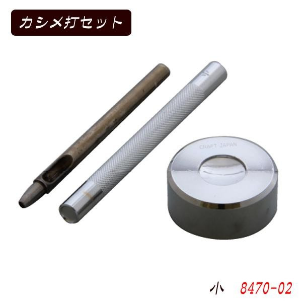 金具を打つために必要な「カシメ打」、かがりや金具の取付け用の丸穴をあける「ハトメ抜き」、取り付けに使用する「打台」のセットです。 |