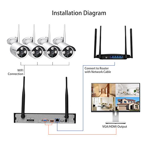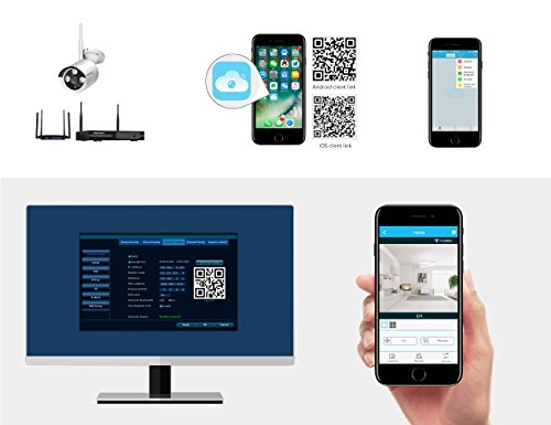 Wireless-Uberwachungs-Kamera-System ermoglicht Ihnen, die Live-Video Remote jederzeit und uberall per Handy und Tablet(Android & IOS-System) abzuspielen.Drahtloses IP-Kamerasystem unterstutzt Sync-Playback, Video-Backup und Bewegungserkennung.