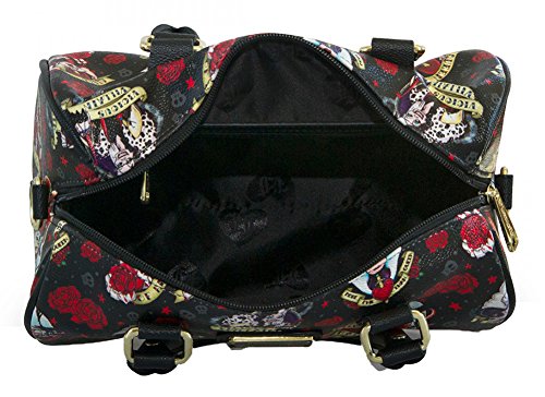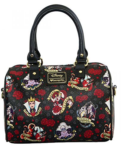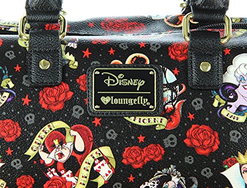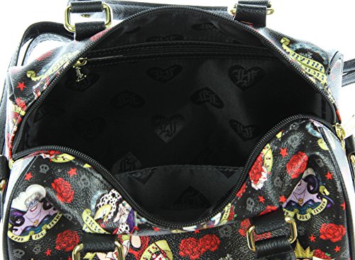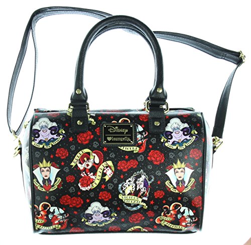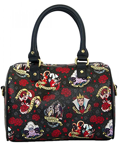 Studio : Loungefly Publisher : Loungefly Product Description The evil female Disney villains are featured with a tattoo design on this licensed Disney wallet. All-over print featuring Queen Grimhilde, otherwise known as The Evil Queen from Snow White and the Seven Dwarves, Cruella De Vil from One Hundred and One Dalmatians, Maleficent from Sleeping Beauty, Ursula from the Little Mermaid and the Queen of Hearts from Alice in Wonderland. Made of black pebble-textured vegan faux leather. This is a boutique quality handbag with lots of great detailing. Inside contains one large zip pocket and two open side pockets. Fully lined in black on black Loungefly logo print fabric. Measures 10 inches wide, 9 inches high, 7 inch depth. 5 inch handle drop. Adjustable and detachable cross body long straps. Vegan friendly. 0