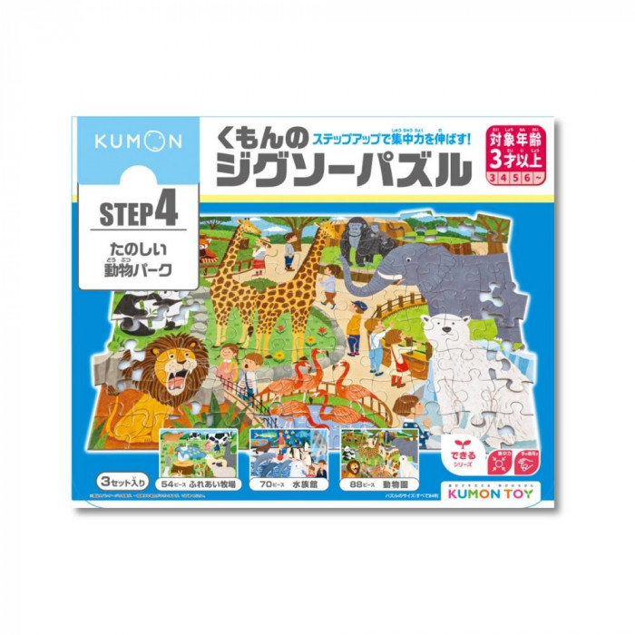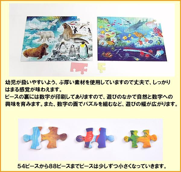| 遊びながら学習につながる集中力と作業力を伸ばす、「スモールステップ」方式のジグソーパズルのセット。このSTEP4は、54ピースのパズルから、88ピースのパズルまで、合計3枚のジグソーパズルがセットされています。少しずつピースを増やしていくことで、パズルを完成させる達成感を味わいながら、集中力と作業力を高めていけます。 |