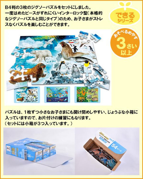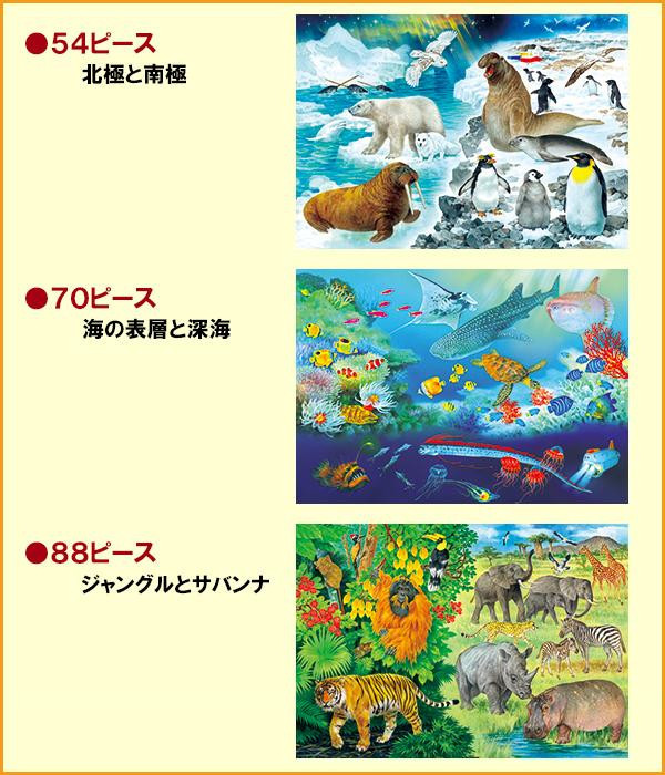 | 北極・南極や海中、熱帯にすむ動物たちの姿を描いたパズル。 |
