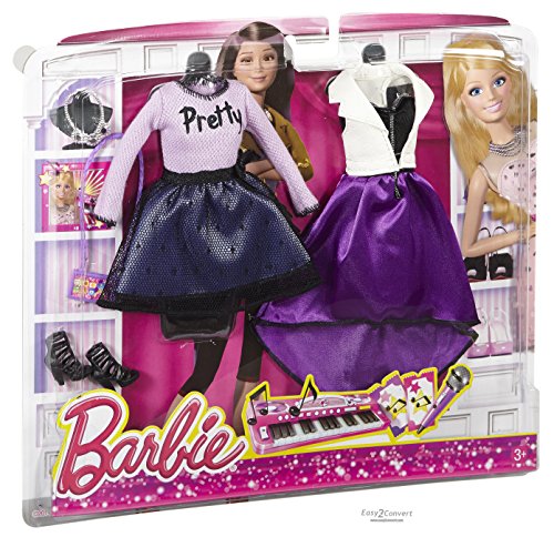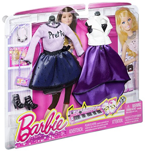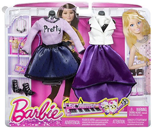 As a trendsetter, Barbie doll knows how to throw an outfit together -- and as a fashion expert, she always has a backup in case her mood or the moment changes! This fashion pack makes the perfect addition to her wardrobe with two outfits and the perfect accessories to pull a look -- and a story together. Girls will love playing out real-life experiences and dreaming up new possibilities with this fabulous line of clothing for Barbie dolls. The pop concert set includes four fabulous fashion pieces that mix and match so girls can really express their own styles: a “pretty” purple sweater with black stitching, a black mesh-covered skirt, a gorgeous black sweetheart dress with satiny purple skirt and a white faux-leather vest. Designed with modern silhouettes, pretty fabrics and glam accents, the clothing will delight girls. A glam pair of black cutout booties, statement necklace and smartphone purse work with each outfit in the pack. Includes four fashion pieces, one pair of shoes, one necklace and one purse; doll sold separately. Fashions fit most Barbie dolls. Ages 3 and older.Feature