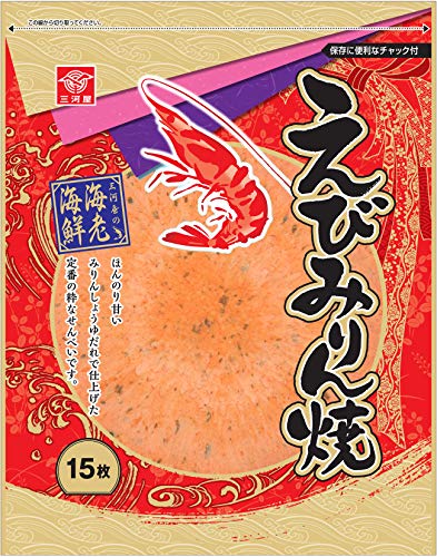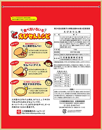 原材料:じゃがいもでん粉、さつまいもでん粉、たれ[しょうゆ(小麦を含む)、砂糖、還元水あめ、みりん、たんぱく加水分解物、風味調味料(煮干し、かつお)]、植物油脂、食塩、えび粉(干しえび粉砕物)、あおさ、デキストリン、唐辛子、加工デンプン、調味料(アミノ酸等)、貝カルシウム、重曹、甘味料(ステビア、甘草)、着色料(黄5、赤3)
