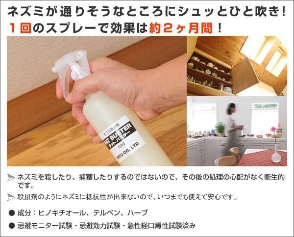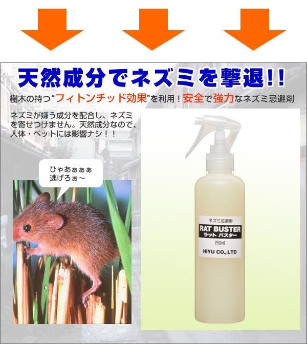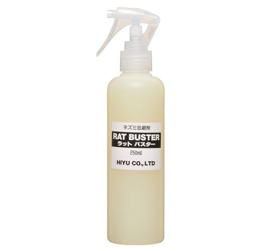 様々な害のもとになるイエネズミ。ラットバスターならネズミが嫌がる天然成分を配合し、ネズミの侵入をしっかりガード。1部屋で約1本使い(標準的な使用量3平米あたり約250ml)、散布後効果が約2ヶ月持続します。赤ちゃんやペット(ネズミ系以外)にもやさしいニオイで森林浴効果もあります。部屋を綺麗にしてラットバスターを使えばネズミが家から出て行くので、死骸処理も必要なく衛生的です。継続して使用されるのがおすすめです。 |