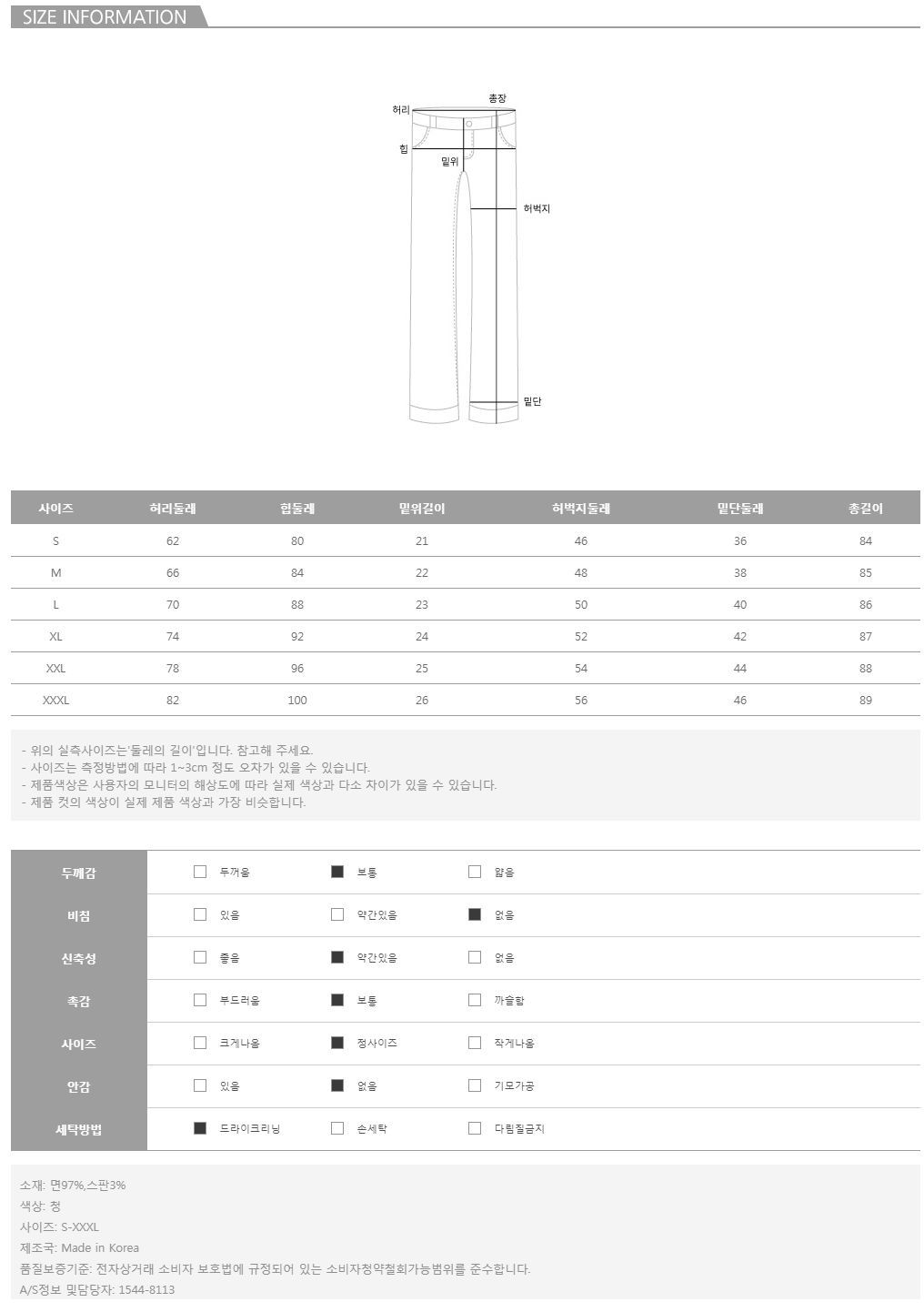 모델의 착용 컬러/사이즈는 청/S 입니다.