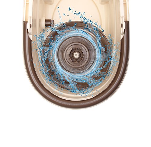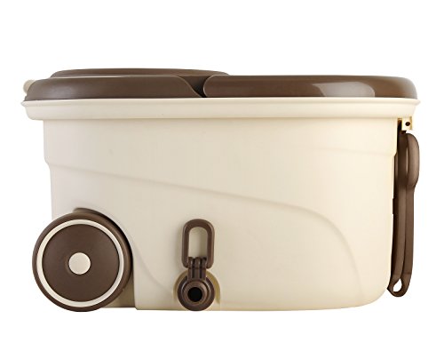 - UNIQUE BUCKET:The water bucket has a quick drying mechanism so youcan rinse the mop from excessive water and have better results, and a unique water release valve so you can easily empty it after you’re done. And with its2 convenient wheels and the unique handles, you will never again have to carry the heavy full bucket around the house!