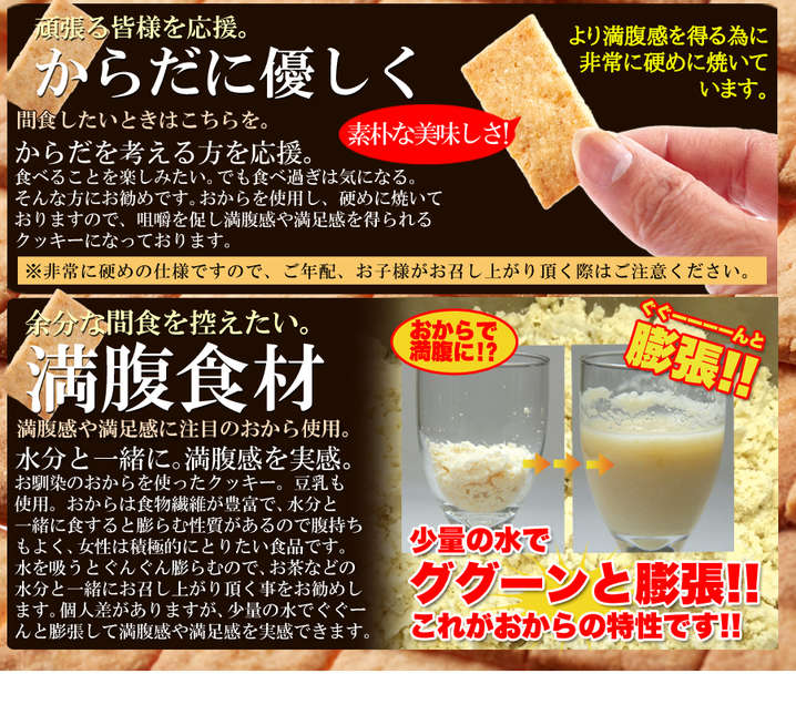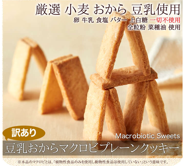 ●原材料名:おから(国産大豆使用)、小麦粉(国産)、砂糖(ビート糖)、菜種油、豆乳、全粒粉