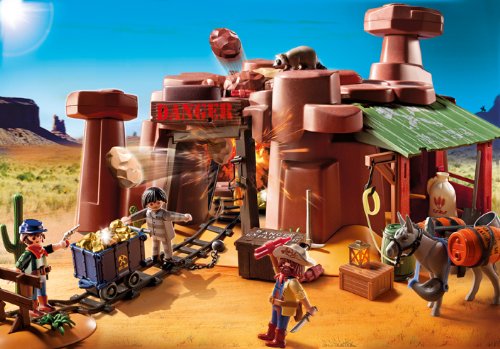 Increase your wealth as you search for gold at the Western Goldmine. Watch out for falling rocks inside the gold mine during the dig for precious metals in the Wild West. Set includes three figures, pack mule, gold pieces, mining cart, train track, functioning lantern, raccoon, and additional accessories. Dimensions: 23.6 x 13.8 x 8.7 inches (LxWxH). Recommended for ages four to ten. Playmobil, Germany's largest toy manufacturer, is headquartered in Zirndorf, Germany and has been producing and distributing toys for more than 36 years. The miniature worlds of Playmobil encourage children to explore and learn while having fun. Children's imaginations are transported to medieval times with the Playmobil castle, to the adventurous seas with Playmobil pirates, and many other themed playworlds. The figures can bend, sit, stand, and turn their heads to make realistic role play possible.Feature