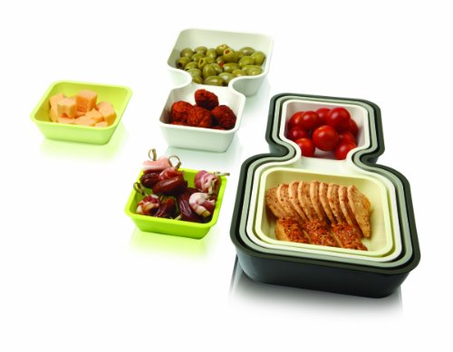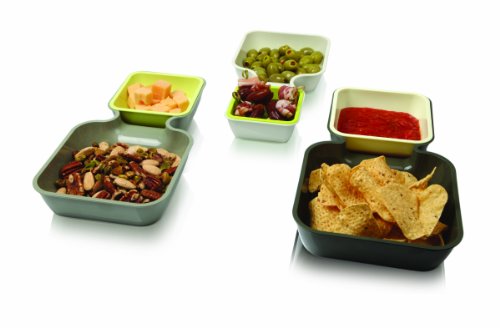 Studio : Vacu Vin Publisher : Vacu Vin Binding : Kitchen Product Description The Vacu Vin Serve Stack is a versitile set of 4 serving trays that nest together when stored. Configure as chip and dip trays or as separate nut, snack, or candy trays to keep foods separate. 0