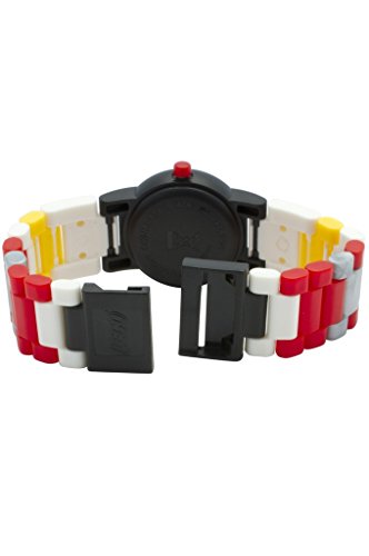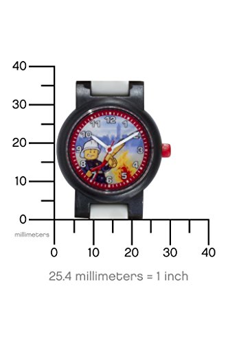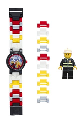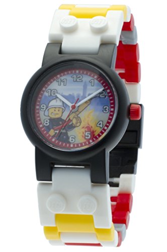 Your child will love telling time with the customizable LEGO Kids' City Fireman Watch. With two interchangeable bezels, two LEGO stud links and a variety of durable LEGO links to create your own personal bracelet. This watch is a great first watch for a young child that promises to enhance creativity and imagination. The round dial featuring the city as well as the fireman displays orange/yellow Arabic numbers, and white hands to track the time. With a long red second hand, an outside minute track, and convenient numbers marking every fifteen minutes on the bezel, time telling is a breeze. Included with this sporty watch is a fireman mini-figure with a fire extinguisher to add to the LEGO collection. With a scratch resistant mineral crystal and a water resistant depth of 165 feet (50 Meters), this watch can keep up with the most adventurous child!Feature