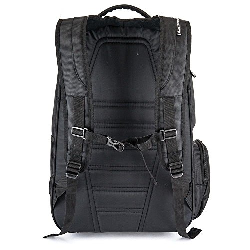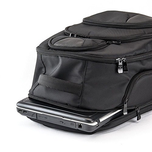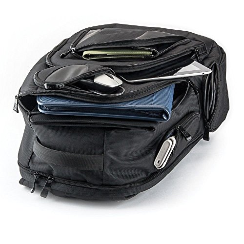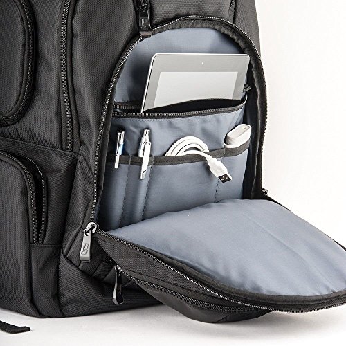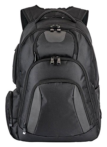 Studio : Basecamp Publisher : Basecamp Binding : Office Product Product Description Pack it all in this sleek but substantial sized laptop backpack! Handsome black 1680D Cross Weave material with black matte PVC accent, 3 Front pockets with zippered closure - including 1 small fleece lined pocket for your glasses or smart phone, Mesh side pocket with elastic opening, 2 zippered side accessory pockets, Large main compartment with dual-zipper closure, TSA friendly fold down laptop compartment with dual zipper closure, Fits up to 17" laptop, Padded top handle and adjustable shoulder straps, and sternum clip. 0