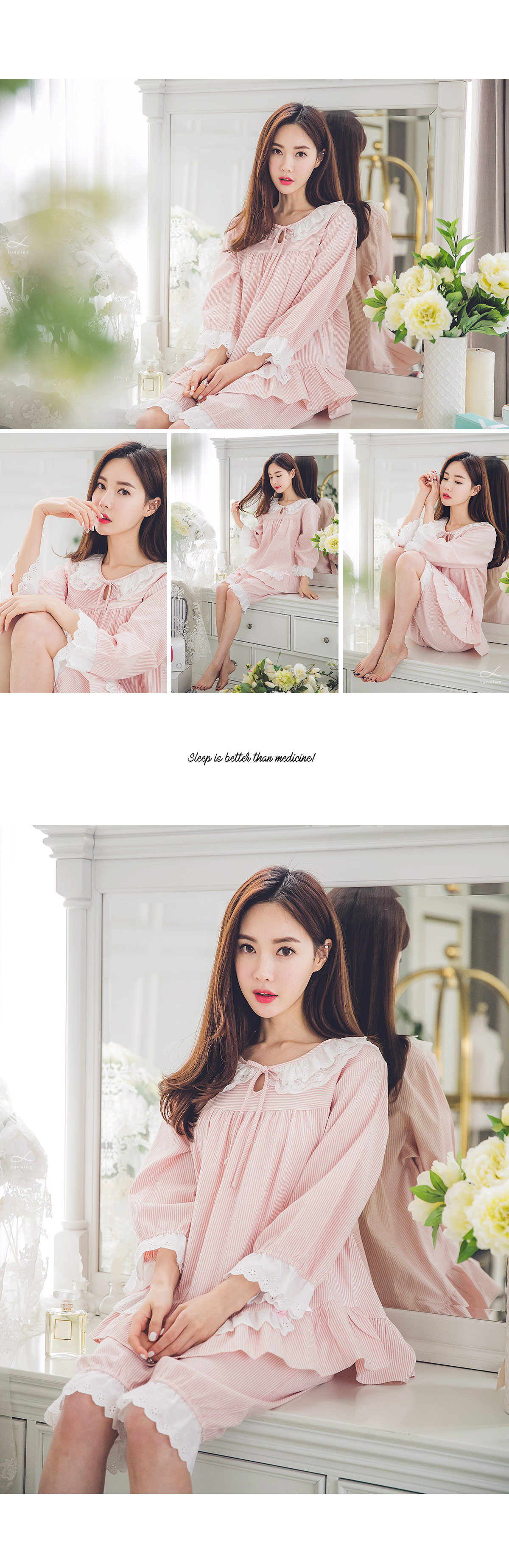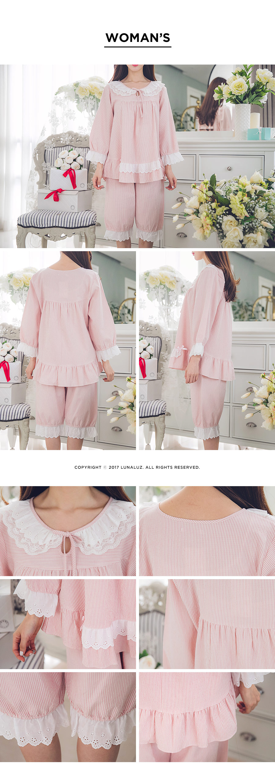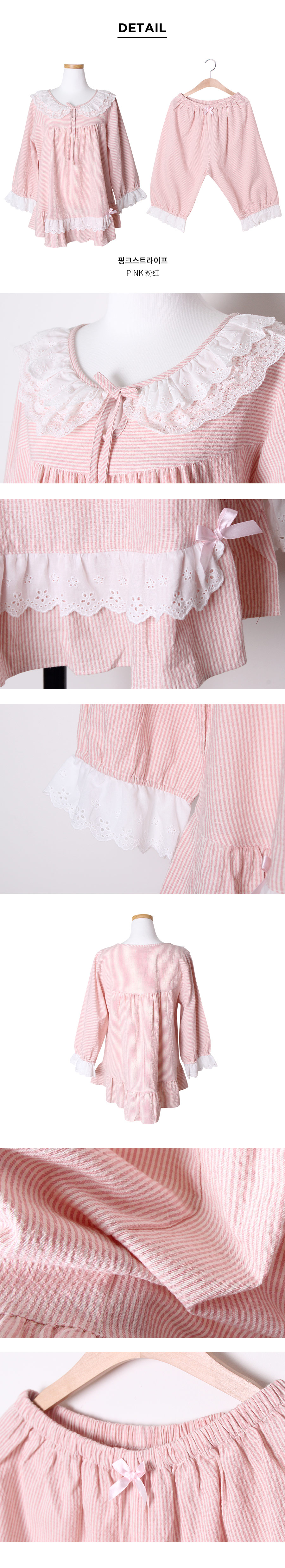 올록 볼록한 리플 소재의 원단이 포인트가 되어주는 고퀄리티 잠옷이에요 : ) 탄탄한 소재와 심플하면서 부드러운 느낌의 핑크톤의 스트라이프로 cozy한 홈웨어룩을 연출하기 좋습니다. 스트라이프로 포인트를 주어 슬림 해 보이는 효과를 주며 실을 직접 염색하여 짠 선염 면 조직으로 세탁하여도 흐트러짐 없는 스트라이프 원단의 고급스러움을 느끼실 수 있습니다. 사이즈는 free사이즈로 평소 44반~66size까지 입으실 수 있는 패턴입니다. 흔하게 사용되는 면 소재가 아닌 톡톡하면서 포인트가 되어주는 리플 소재의 원단입니다. 100% 국내에서 제작되어 퀄리티가 좋고 봉제선이 깔끔합니다. 여리하면서 소녀스러운 느낌을 내어주는 적당한 네크 라인과 가운데 여밈 끈으로 포인트를 주었고요. 네크 라인 밑으로 다른 느낌의 레이스 장식을 2중으로 덧대어주어 분위기가 확 살아나요. 소매 부분은 A라인으로 떨어져 더욱 날씬하고 걸리쉬한 느낌을 내어준답니다. 상의의 밑 부분에 레이스 장식을 달아주어 다시 한 번 포인트를 주었어요. 팬츠는 5~6부 정도 되는 기장으로 러블리하게 연출하기 좋습니다. 소재가 탄탄하고 핏을 잘 잡아주어 실루엣이 여리 해보입니다.