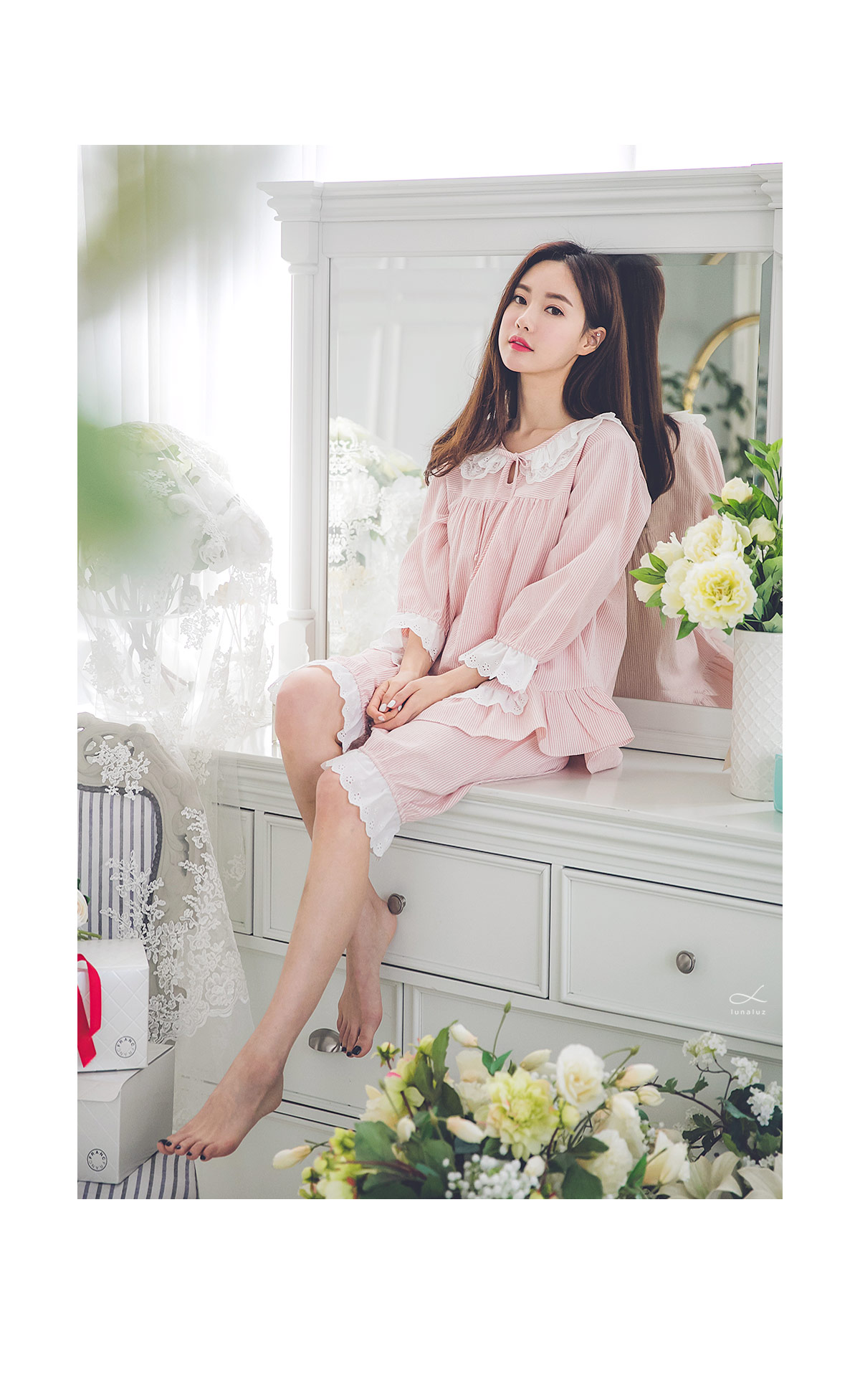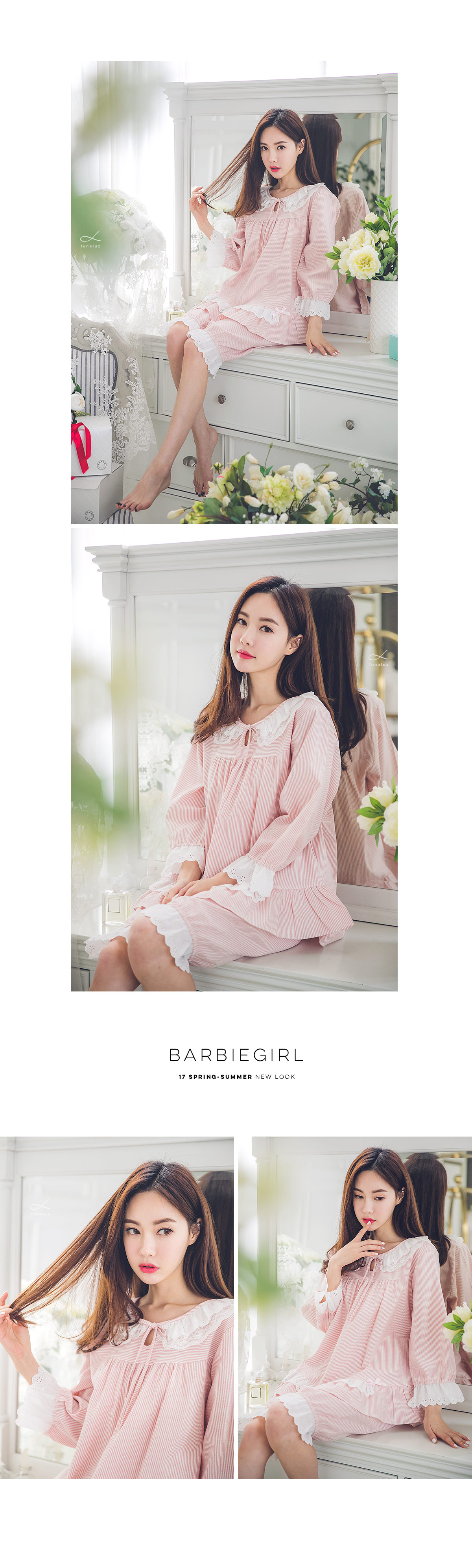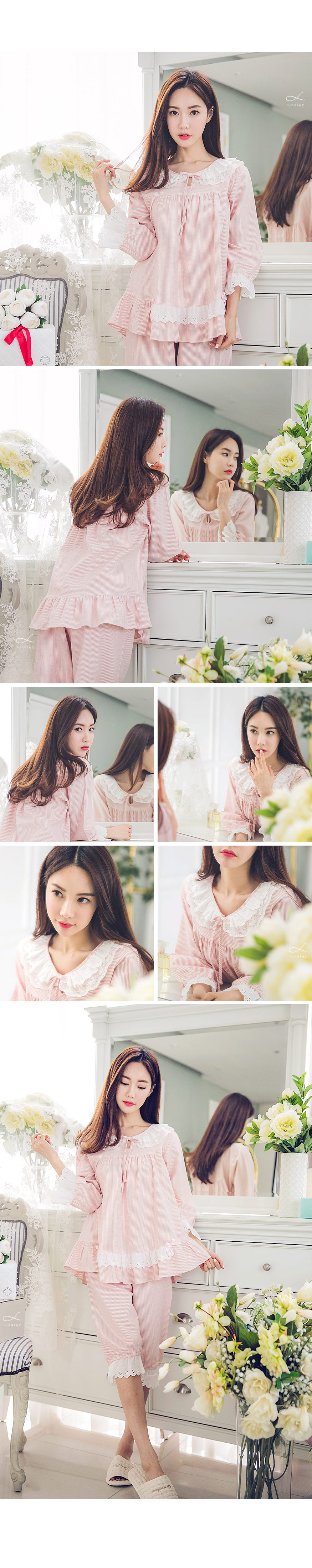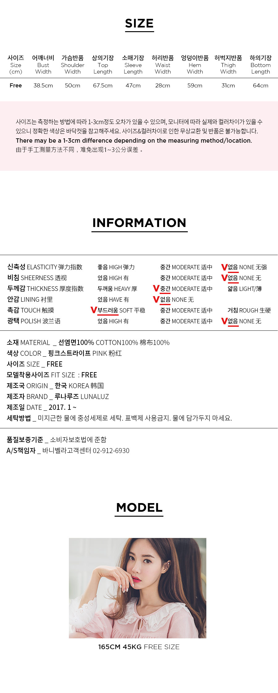 올록 볼록한 리플 소재의 원단이 포인트가 되어주는 고퀄리티 잠옷이에요 : ) 탄탄한 소재와 심플하면서 부드러운 느낌의 핑크톤의 스트라이프로 cozy한 홈웨어룩을 연출하기 좋습니다. 스트라이프로 포인트를 주어 슬림 해 보이는 효과를 주며 실을 직접 염색하여 짠 선염 면 조직으로 세탁하여도 흐트러짐 없는 스트라이프 원단의 고급스러움을 느끼실 수 있습니다. 사이즈는 free사이즈로 평소 44반~66size까지 입으실 수 있는 패턴입니다. 흔하게 사용되는 면 소재가 아닌 톡톡하면서 포인트가 되어주는 리플 소재의 원단입니다. 100% 국내에서 제작되어 퀄리티가 좋고 봉제선이 깔끔합니다. 여리하면서 소녀스러운 느낌을 내어주는 적당한 네크 라인과 가운데 여밈 끈으로 포인트를 주었고요. 네크 라인 밑으로 다른 느낌의 레이스 장식을 2중으로 덧대어주어 분위기가 확 살아나요. 소매 부분은 A라인으로 떨어져 더욱 날씬하고 걸리쉬한 느낌을 내어준답니다. 상의의 밑 부분에 레이스 장식을 달아주어 다시 한 번 포인트를 주었어요. 팬츠는 5~6부 정도 되는 기장으로 러블리하게 연출하기 좋습니다. 소재가 탄탄하고 핏을 잘 잡아주어 실루엣이 여리 해보입니다.