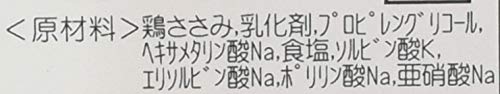原材料:【ファースト 国産ささみ 細切り ソフトタイプの原材料】 鶏ささみ、ソルビン酸K(保存料)、グリセリン(増粘安定剤)、プロピレングリコール(安定剤)