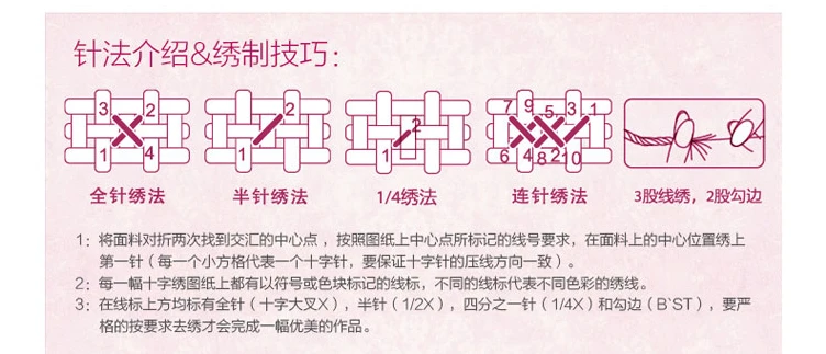 Please note: one embroidery thread can be divided into 6 strands, for this 11ct, please use 3 strands of one to stitch