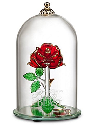 - Fully sculptured tinted glass rose Glass dome with frosted Beauty and the Beast logo and jeweled topper Golden accents Mirrored base with beveled edge Non-skid feet Created by world-renowned Arribas Brothers