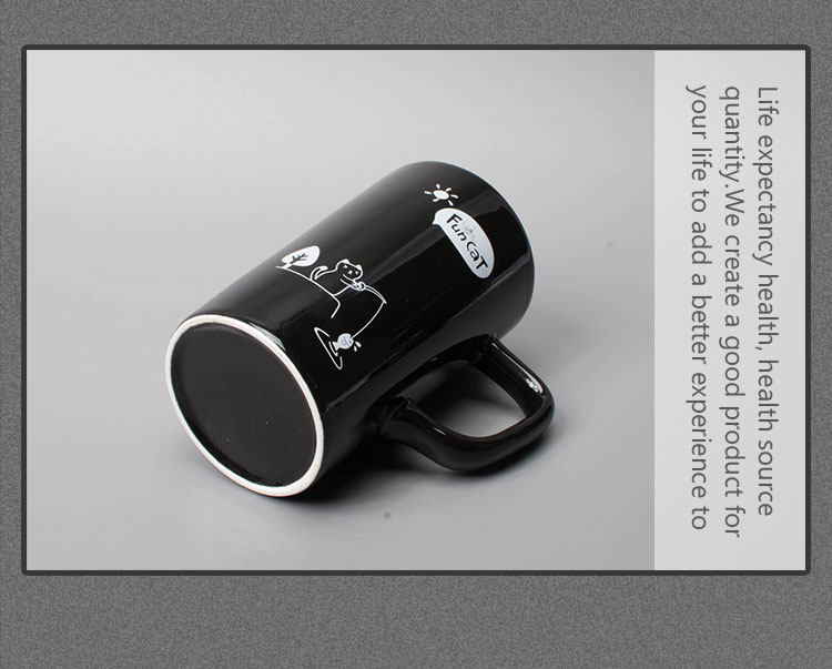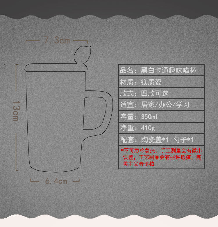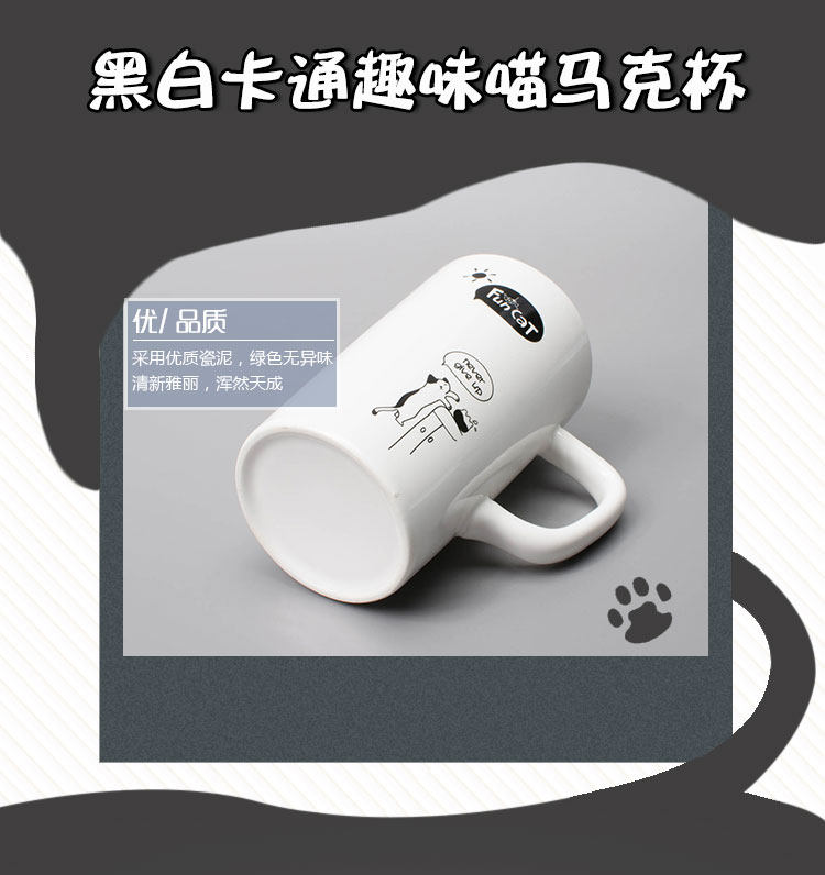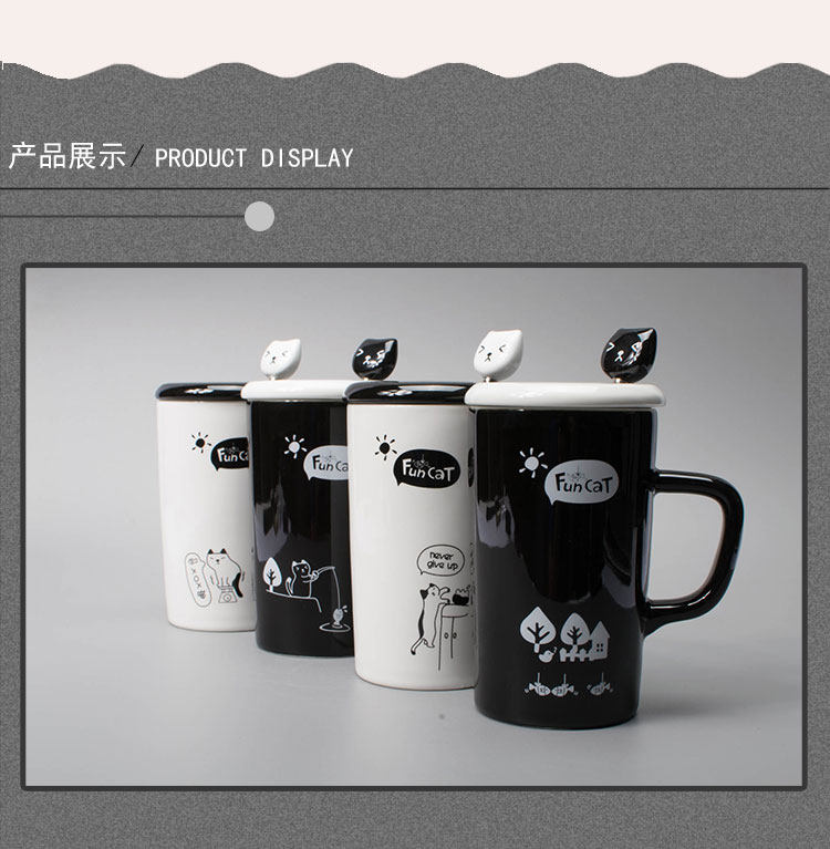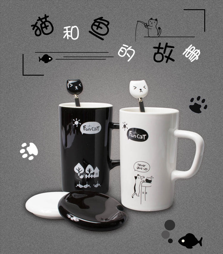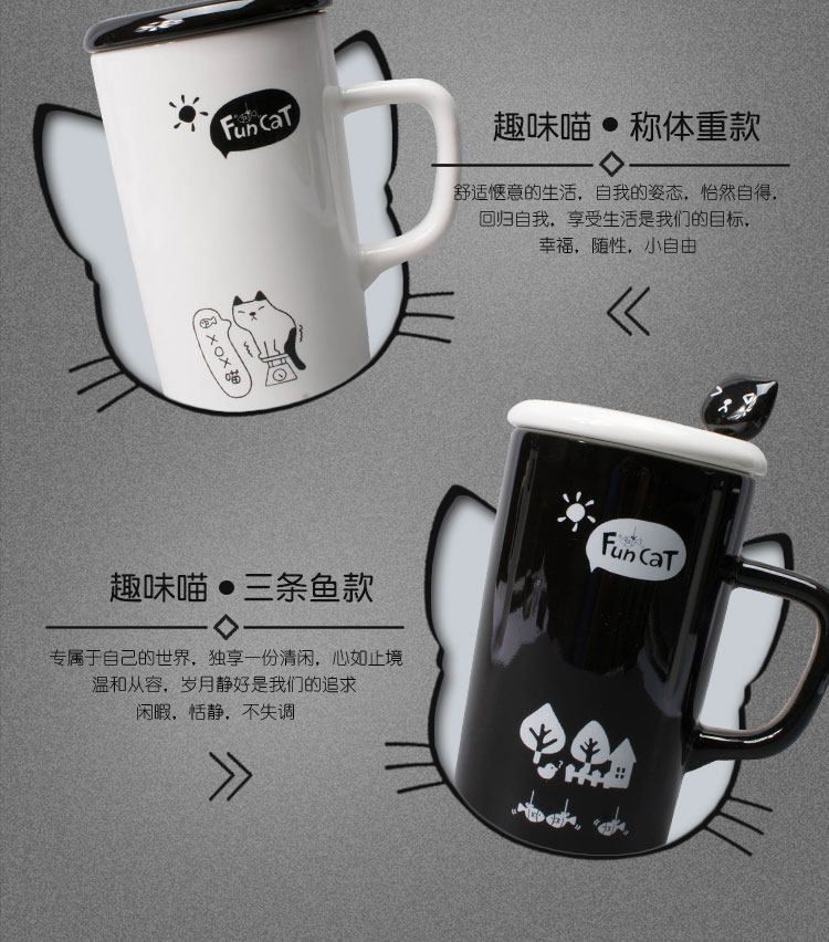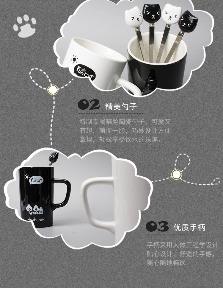 创意黑白趣味喵立体勺马克杯陶瓷咖啡杯带盖带勺喝水杯简约