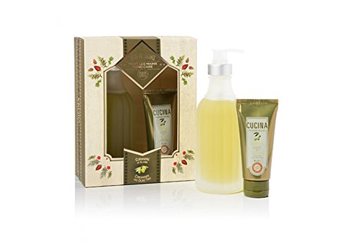 Treat your favourite chef to pampering joy with this kitchen gift collection that includes all the key products of our Cucina line. Enriched with first cold-pressed olive oil, the hand soap and nourishing butter moisturize skin, leaving hands delicately scented. The scented candle and fragrant mist pairs perfectly with cooked dishes for a delicious atmosphere. Hand Soap with olive oil: Dispense a small amount onto hands, rub together to create a lather and rinse. Nourishing Hand Butter: Apply a small amount to the back of each hand and rub hands together in a gentle circular motion.Feature