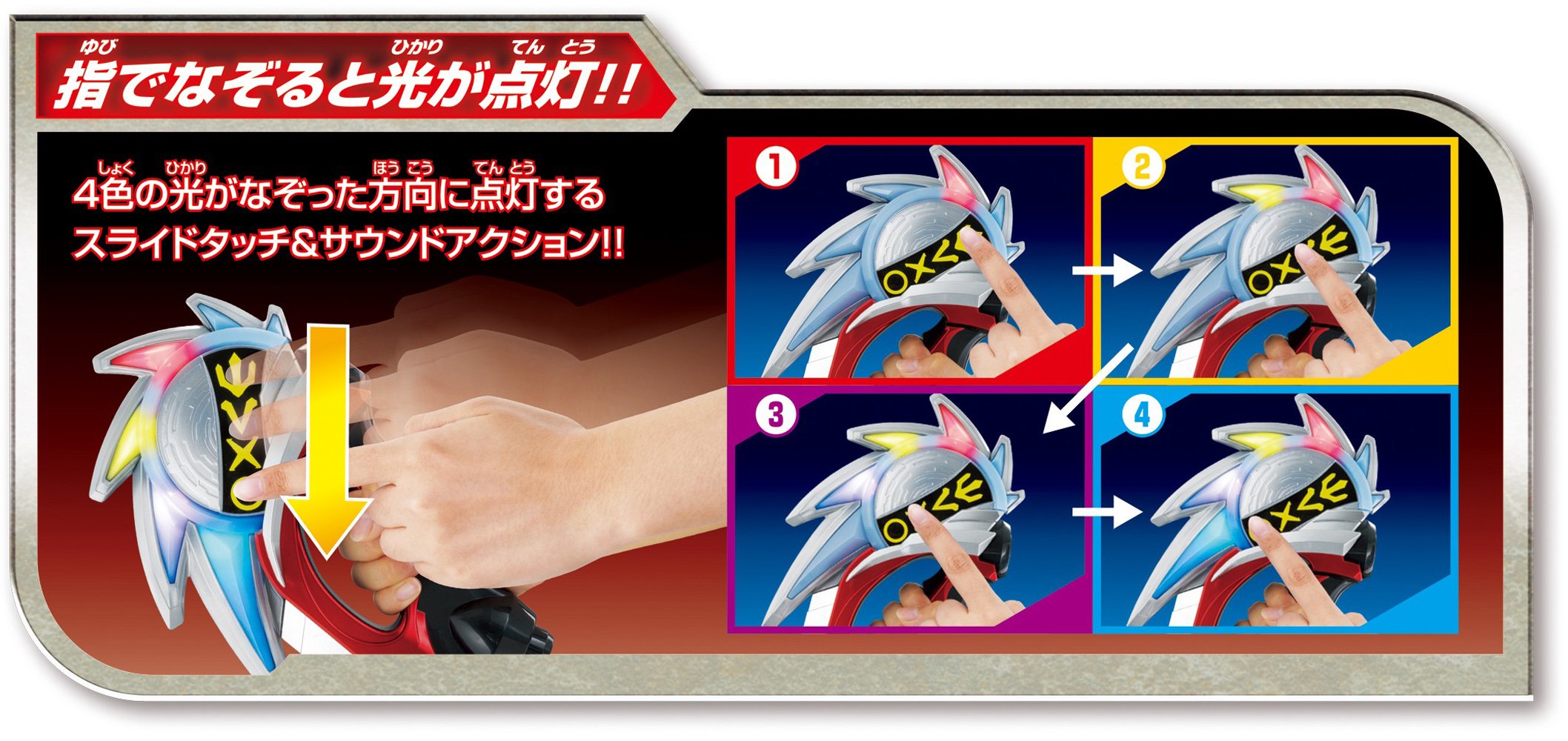 Tracing the electrostatic sensor with your finger lights up 4 LEDs! You can activate transformation play and various deathblows.