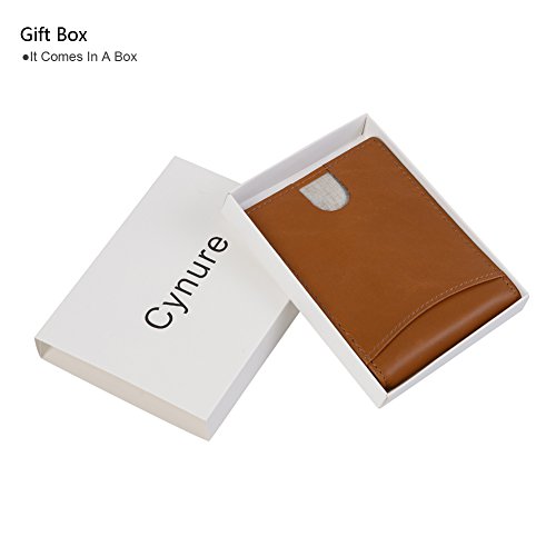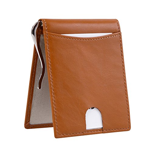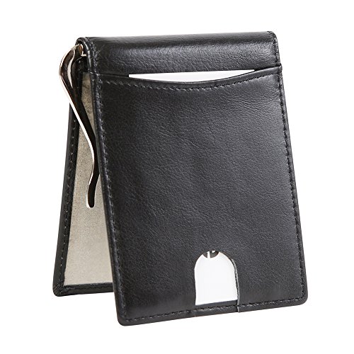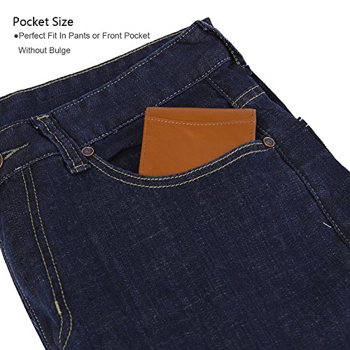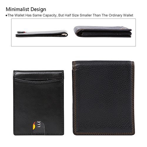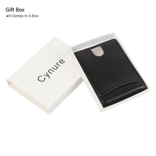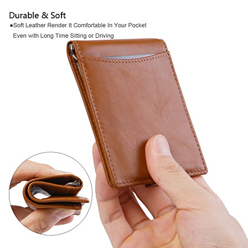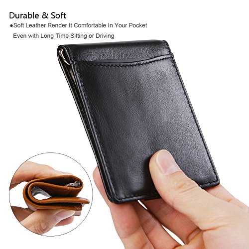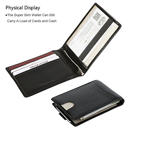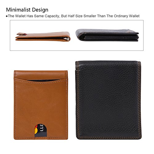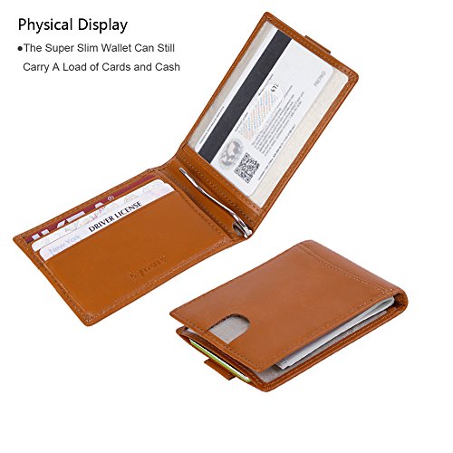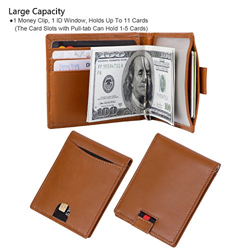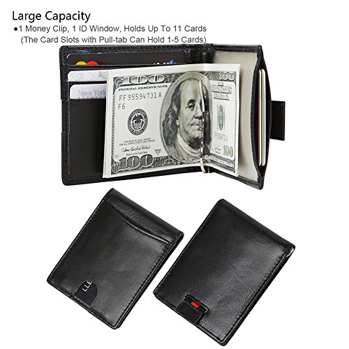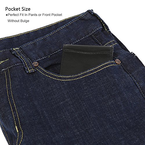 Features Structure: 6 Card Slots Holds Up To 10 Cards, 1 ID Window, 1 Money Clip Measures:Length:4.33"(11cm), Width:3.15"(8cm), Thickness:0.39"(1cm), Weight:60g Minimalist Design: Perfect Fit In Pants / Front Pocket Material: Main Material: Full Grain Cow Leather,soft and Durable; Inner Material: RFID Blocking Fabric RFID Blocking: RFID Blocking Layer To Help Prevent The Unwarranted Scanning of Identification, Credit and Debit Cards