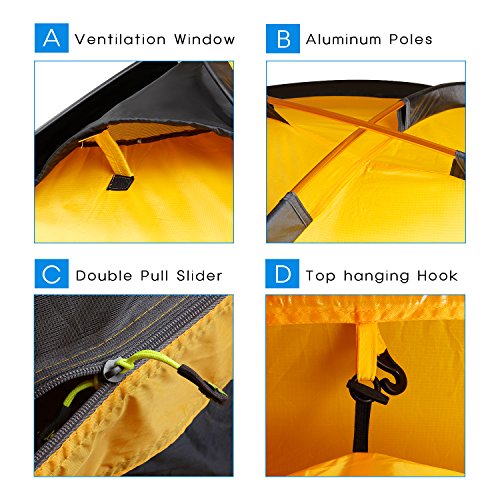 COMPREHENSIVE DESIGN: Features inner pockets to keep your personal items organized and allow for easy access. The top hanging hook is designed for hanging camping lights. The two-way zipper makes for convenient entry and exit.