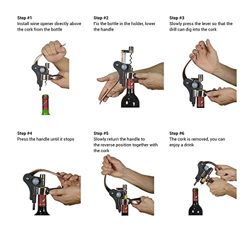 How to use: Only 5 simple steps !!! 1) Put wine opener directly above the cork from the bottle 2) Fix the bottle in the holder and lower the handle 3) Slowly press the lever in order to the drill can dig the cork 4) Press the handle until it stops 5) Slowly return the handle to reverse position. Wine cork will be removed 6) The cork is removed, you can enjoy your drinks.