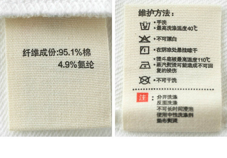 洗涤标准:不可浸泡不可漂白悬挂晾干40℃以下手洗110℃以下反面熨烫不可干洗