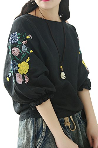 -. Title : (アッシュランゲル)ASHERANGEL レディース 綿麻刺繍ブラウス 花柄シャツ 森ガール バルーンスリーブ かわいい (フリーサイズ, ブラック)