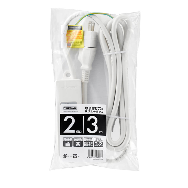 ●ヤザワ Y02EJNP203WH2PA 抜け止めタップ 3ピン式 2個口 3m 取り付け穴付 ホワイト