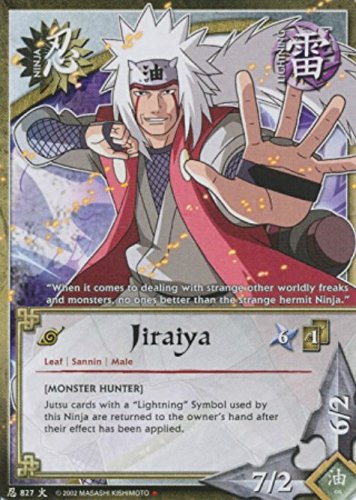 -. Binding : Toy -. Brand : Naruto -. EAN : 0791932214664 -. Feature : A single individual card from the Naruto trading and collectible card game (TCG/CCG). / This is of Uncommon rarity. / From the Starter set. -. IsAdultProduct : 0 -. Label : Bandai -. Manufacturer : Bandai -. ProductGroup : Toy -. ProductTypeName : TOYS_AND_GAMES -. Publisher : Bandai -. Studio : Bandai -. Title : Naruto Card - Jiraiya 827 - Starter Set - Uncommon -. UPC : 791932214664