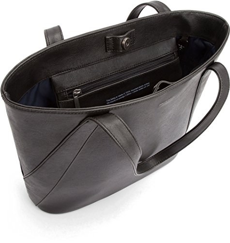 Tote with magnetic snap closure. INTERIOR: logo-embossed hanging pouch pocket, small dogclip. 100% recycled nylon lining.