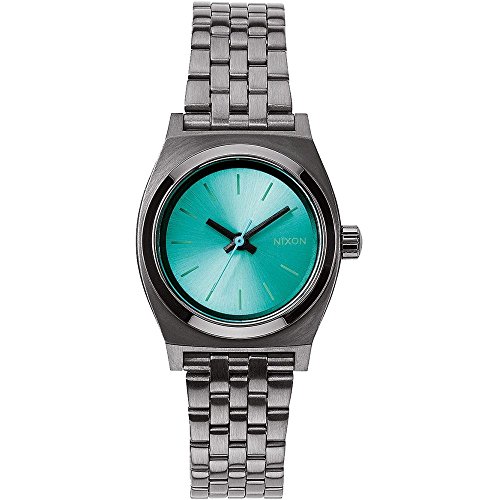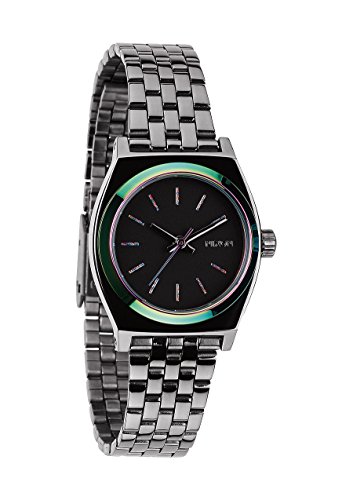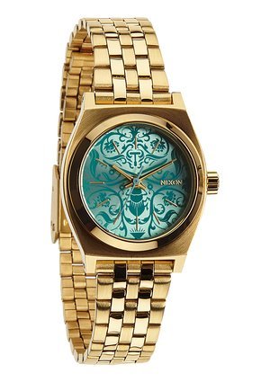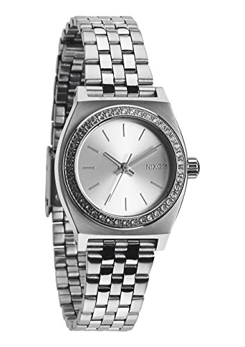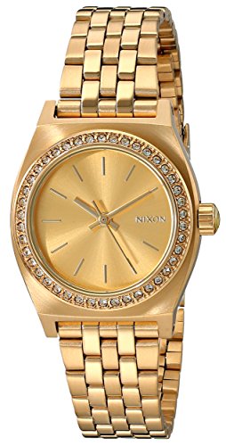 A scaled-down Nixon watch with a brushed, rose gold-tone finish. Sleek markers detail the numberless dial, and a raised bezel accents the rounded square case. Hinged-snap clasp.