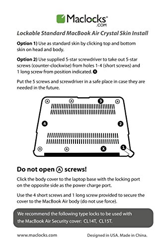 -. Feature : Compatible with Macbook Air 11" / Also Fits the new MacBook Air / Easy & Quick Installation / The MacBook Air Lock and Security Case Bundle Includes: MacBook Air Security Case and Cover & MacBook Air Security Cable Lock / Built-in security slot works with any standard cable lock / Color: Clear / 6-foot cable lock / Includes 2 keys