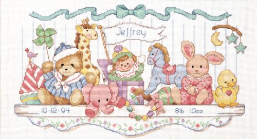 Adorable childhood toys in pretty, pastel shades will add a classic decorating touch to any nursery. Everything for personalizing this future heirloom is included. Kit contains cotton embroidery thread, 14-count white Aida, thread palette, needle and easy instructions including alphabet and number chart for personalizing. Finished size: 16 by 9 inchesFeature