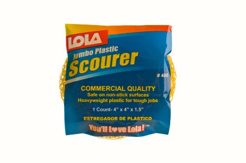 Studio : Lola Products Publisher : Lola Products Binding : Kitchen Product Description This is Lola's Jumbo Plastic Mesh Scourer made of a polypropylene knitted mesh that won't scratch non stick or coated cookware. It is odor resistant and rust proof. Its jumbo size lends itself to the really big jobs. Measures: 6.5-Inch L by 1.5-Inch H by 4.625-Inch W. 0