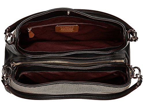 Lined interior features a center zipper compartment, one zip pocket, and multiple slip pockets.