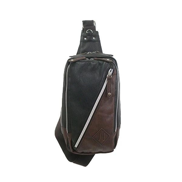 斜めのファスナーで切り替えた合皮のボディバッグ。スリムでスタイリッシュな印象がオシャレです。