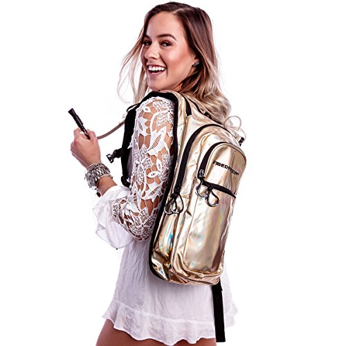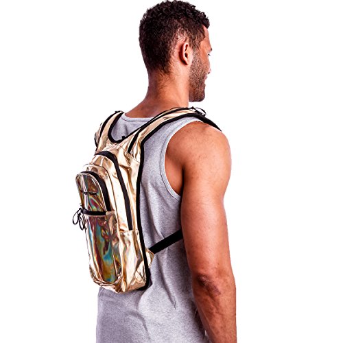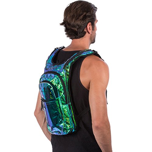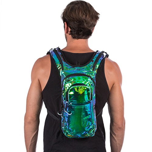 -. Feature : 2.0 Liter BPA Free, Antimicrobial Water Bladder Included. / Bag Dimensions: 17" x 10" x 3.5" Comes with adjustable chest and shoulder straps to fit all sizes and a padded p-board backside for all-day comfort / Tons of storage space! Main Pocket: 15" x 9", Secondary Pocket: 13" x 6", Front Pocket: 8" x 5". / Plenty of room to store spare clothing, wallet, phone, charger, sunscreen, snacks, accessories, and other festival goodies! / Feel out of this world, our silver holographic pack will make you the brightest shining star at your next festival or rave.