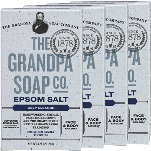 NEW IMPROVED BAKING SODA now known as Epsom Salt for a deep cleanse. Pure Epsom salt and baking soda work double duty to remove even the most challenging dirt, grease and grime and leave skin feeling cleansed and soothed. Hardworking, simple, pure ingredients are the heart of the Grandpa Soap Company's natural soapmaking tradition. Face & body bar soap made with USP grade epsom salt and baking soda for an all-purpose cleaner. All natural, 100% vegetable base. NO PHTHALATES, SULFATES, PARABENS, EDTA, GLUTENS, ANIMAL BY-PRODUCTS, ARTIFICIAL FRAGRANCES OR COLORANTSFeature