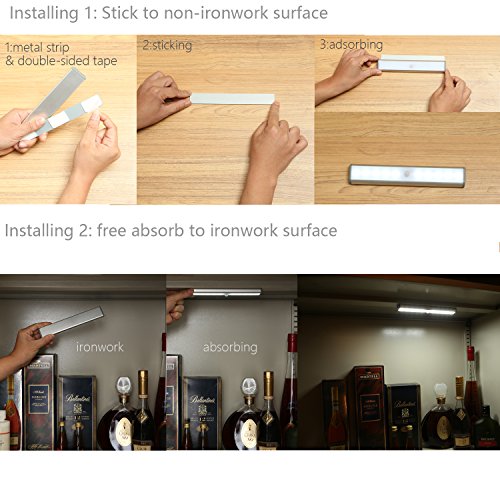 Integral Aluminium alloy shell with magnet inside,so very easy install this light strips without any tools in 2 ways.WAY 1: Just free attach to any ironwork surface,like refrigerator,barbecue or inside the gun safe;WAY 2:First stick the included metal strip with double-sided tape on any non-ironwork,clean surfaces,than attach the magnetic light bar.Portable,Free exchange places per your desires.