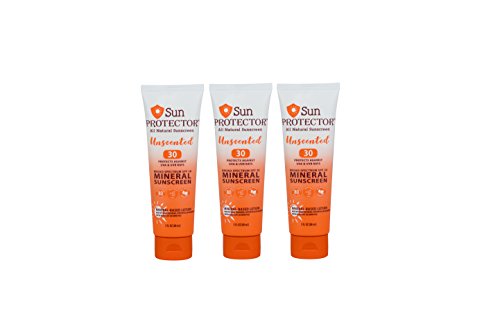 Finally a quality, non-toxic sunscreen at a great price! Apply this broad spectrum SPF 30 mineral sunscreen and enjoy the outdoors! Sun Protector's natural broad spectrum SPF 30 mineral sunscreen lotion is formulated with zinc oxide, and provides effective protection from UVA and UVB rays. Made with skin-soothing organic ingredients, this daily sunscreen lotion for face and body is lightweight and blends easily. Our all natural certified organic sunscreen is formulated without fragrance for those with skin sensitivities, or those who prefer no added fragrance. Active Ingredients: Zinc Oxide Non-nanoparticle (18.75%) Inactive Ingredients: Beeswax* Coconut Oil*, Sunflower Seed Oil*, Jojoba Seed Oil*, and Vitamin E (Non-GMO). *Certified Organic IngredientFeature